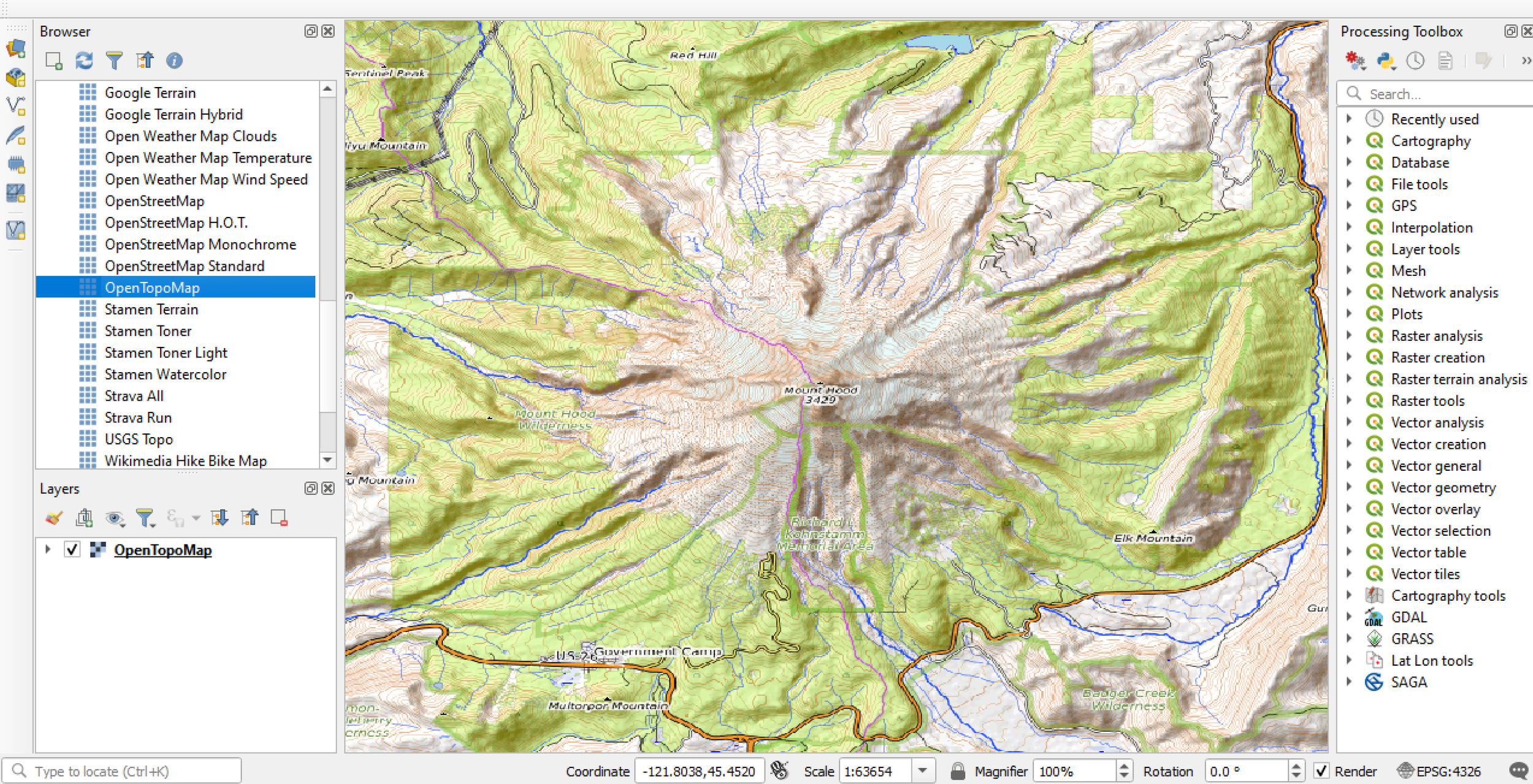 After installing the SRTM-Downloader plugin, you’ll want to add in a basemap and zoom in to your area of interest (AOI). Here, I am using an OpenTopoMap as the basemap. My AOI is Mount Hood, OR.