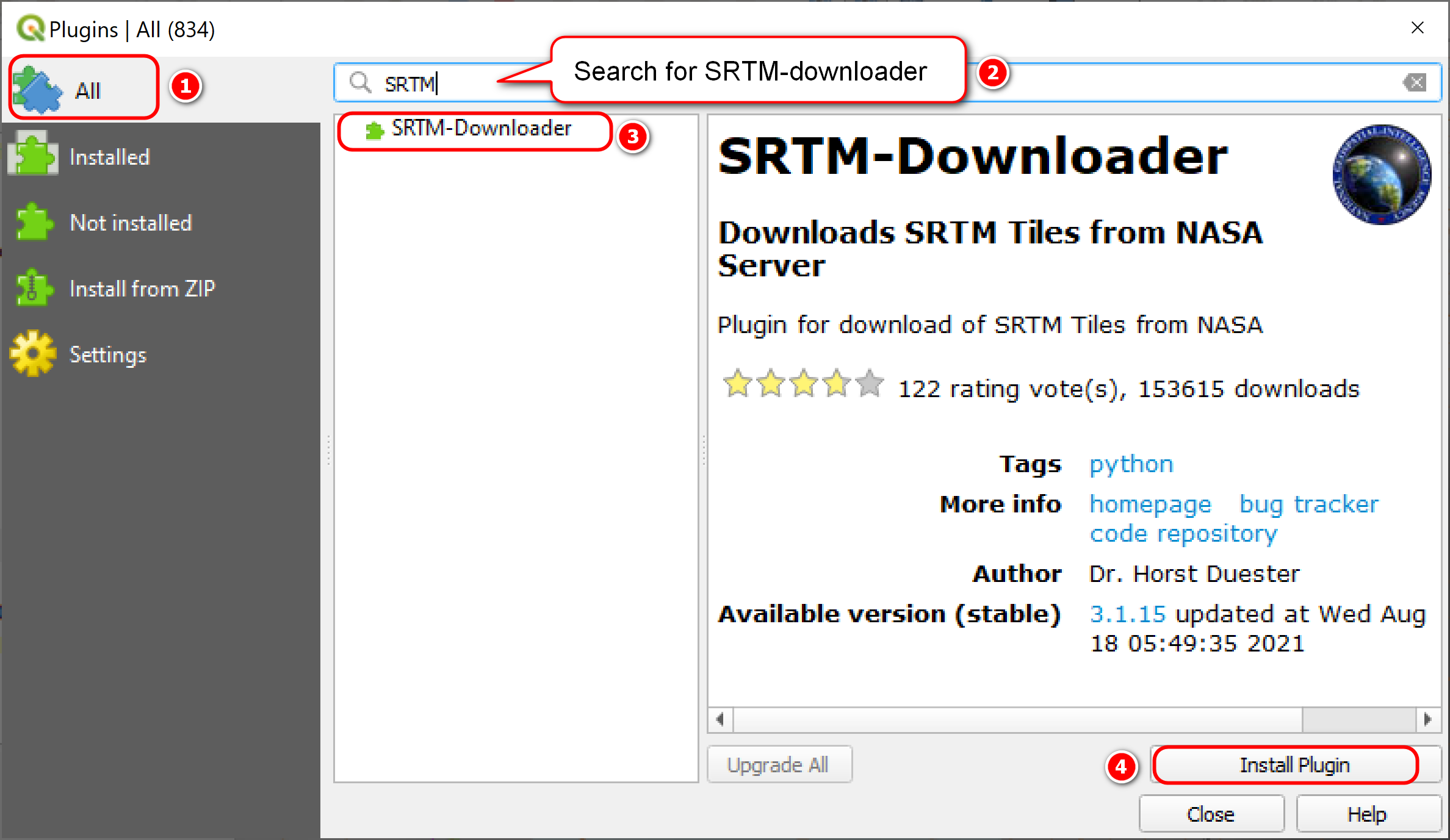 select All >> search for SRTM-Downloader and select it >> Click Install Plugin.