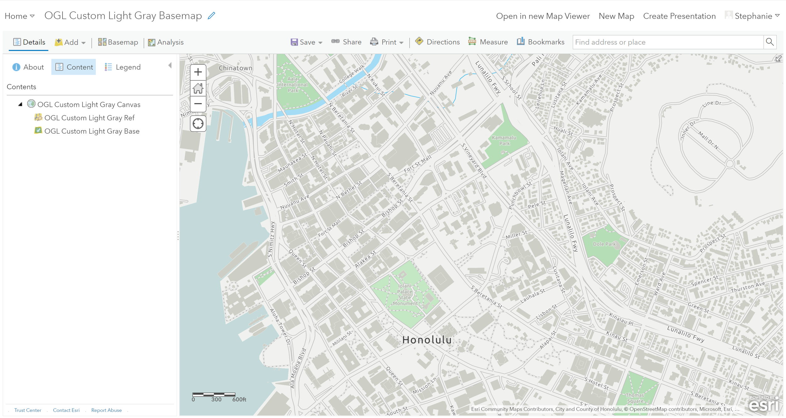 For this example, I am using the Human Geography basemap which has 3 layers: a Reference (labels), Details (features), and a Base (Land & Water only). For the Reference layer I’m just going to remove the Hawaiian Home Land labels, so I can manually add in my own labels later. For the Details layer I’m going to color the ocean blue. For the Base layer, I’m going to remove the background and change the transparency of the Land areas - this is so I can manually add in a hillshade later. Refer to the Adding Hillshade section in the Vector Tile Style Editor documentation for more info. After you are done customizing, you can go back to the main basemap gallery selection and see your styles in My Styles section.