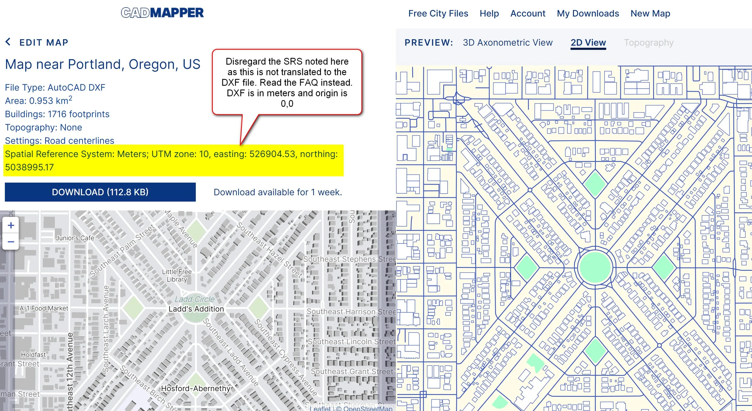 The demo DXF file used here was downloaded from CAD Mapper website. You can use this site to download publicly available data such as OSM and USGS as DXF files - free for areas up to 1 km2. If you’re using this site, disregard the CRS/SRS that’s noted in the download section - see example snapshot below, which shows a small sample area of Ladd’s Addition neighborhood in Portland.