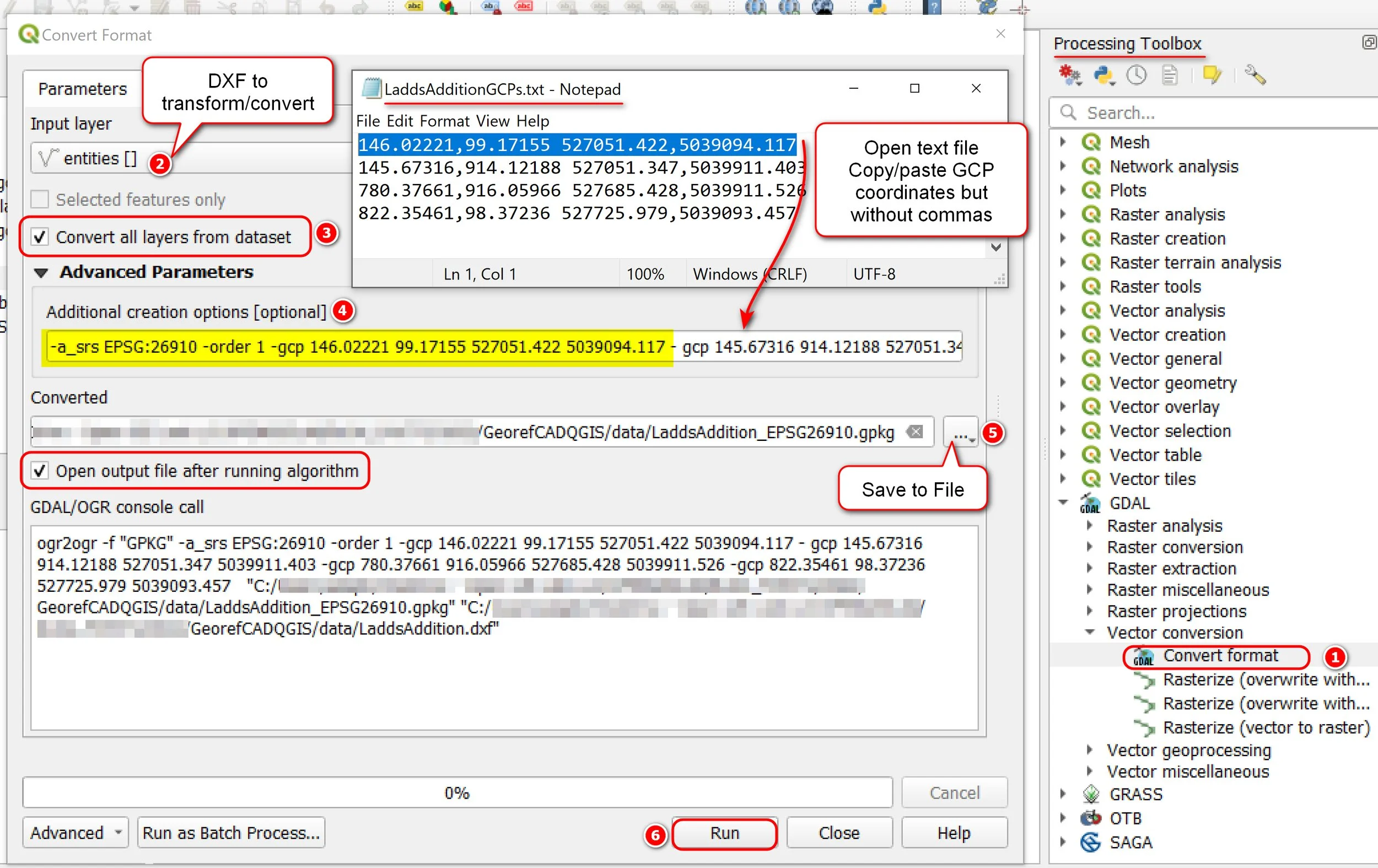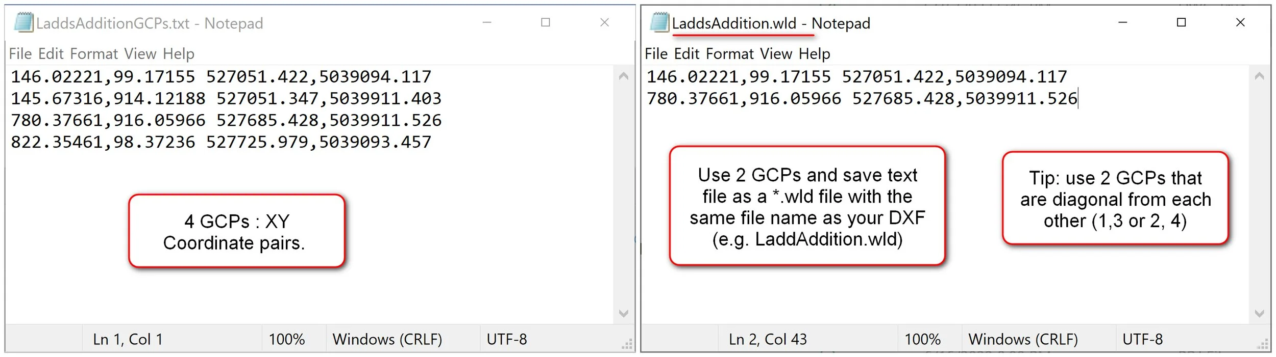 Here is the XY coordinate pairs for the 4 GCPs in a text file. Select two GCPs that you want to use and save the text file as a world file (*.wld) with the same name as my DXF file (e.g. LaddsAddition.wld). You will use this world file in the next step to transform/georeference the DXF — the transformation (affine method) uses only 2 GCPs - hence why you only have two points in the wld file.