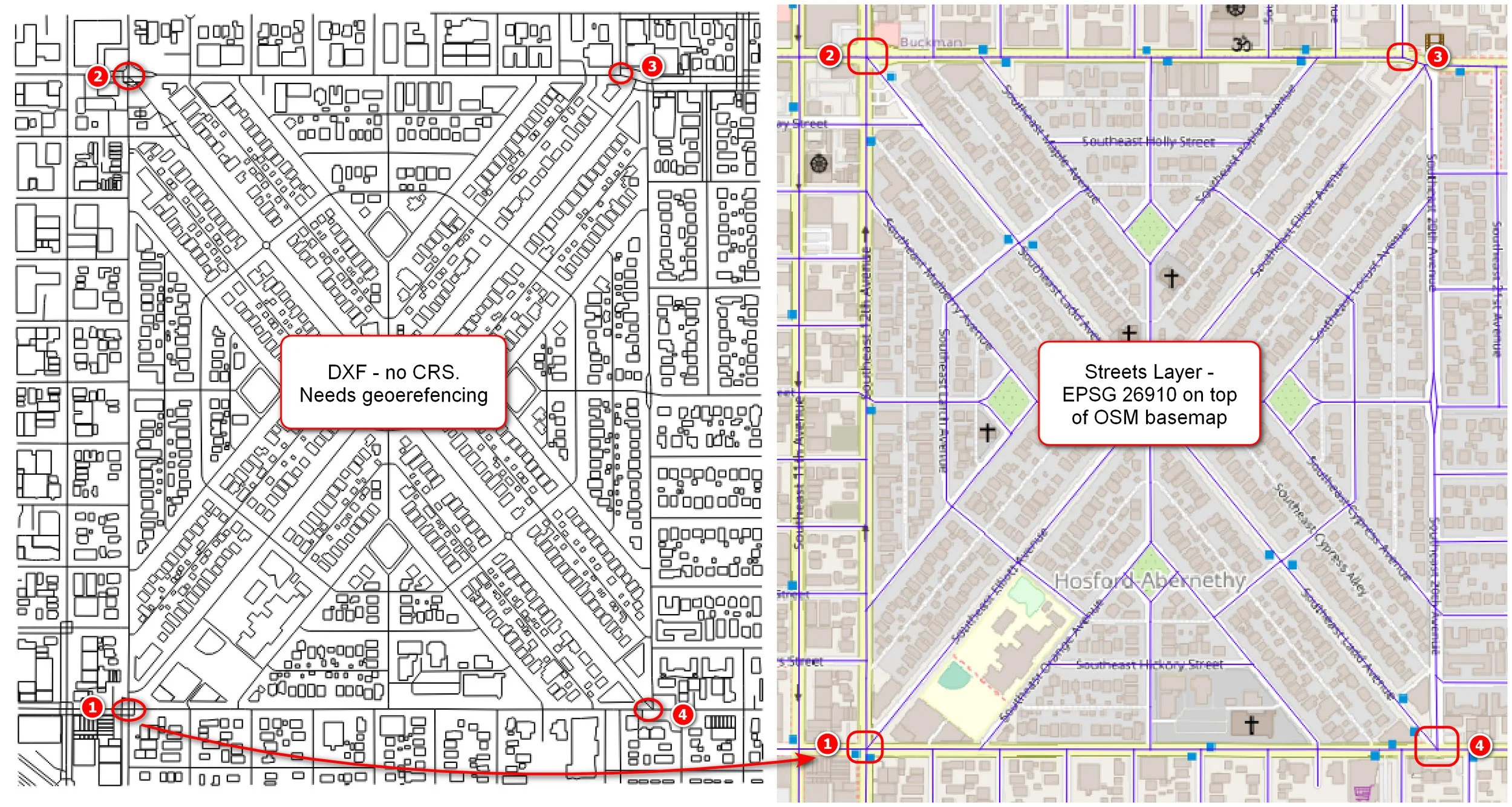 Looking at the DXF and my Streets/OSM views, I picked 4 corner points to use as my GCPs - see below. Once you find the locations you want to use as GCPs, it’s a good idea to create spatial bookmarks for them so you can easily jump to them later.