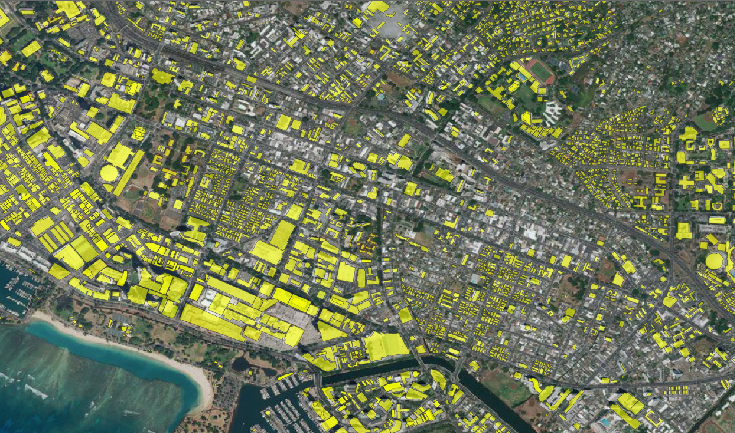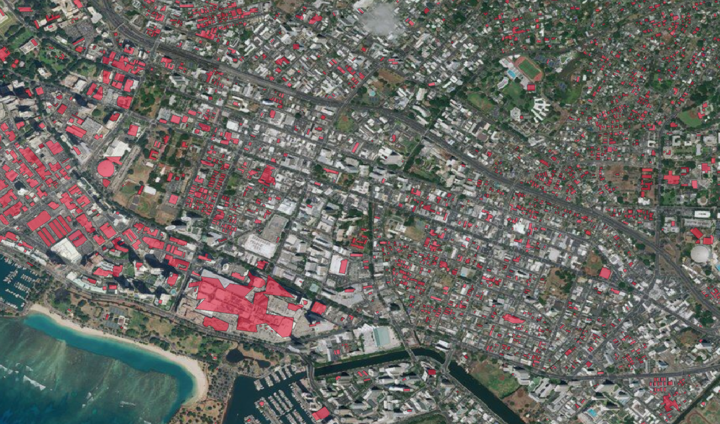 City and County of Honolulu building footprints (orange polygons) overlaid on Bing Aerial
