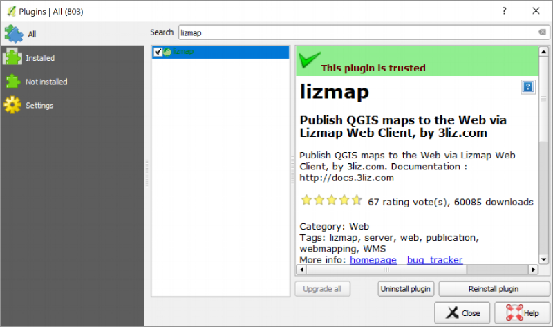 1. In QIGS, go to Plugins menu >> Manage and Install Plugins. In the Plugins window, search for Lizmap then install the plugin