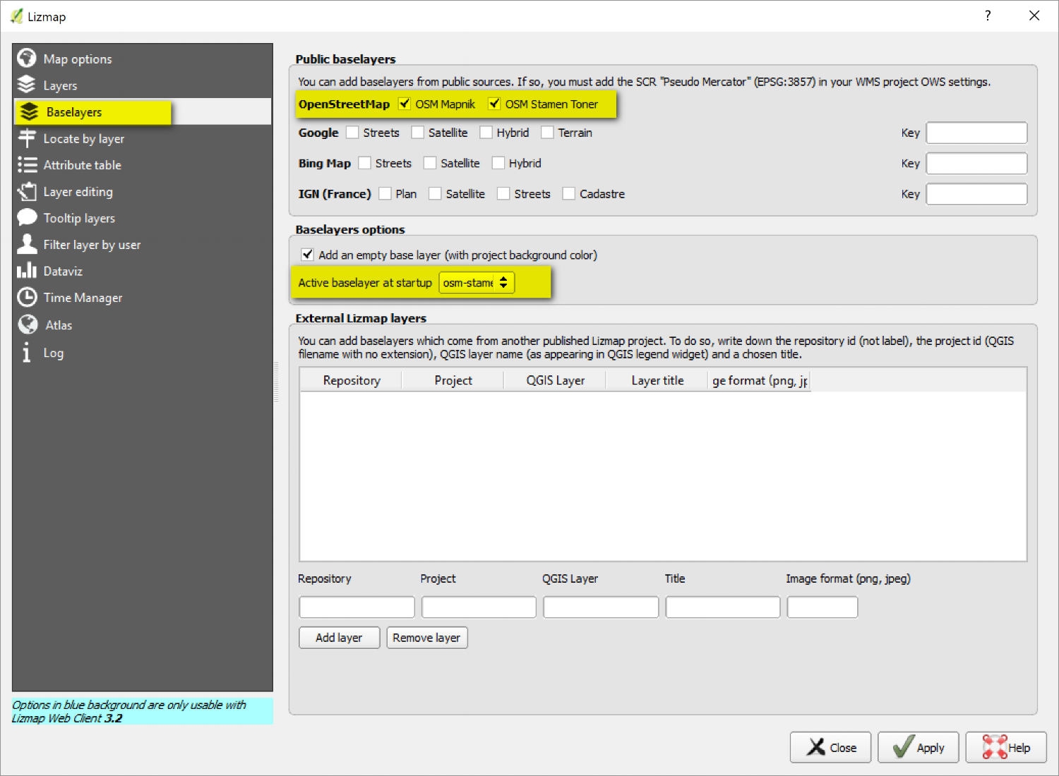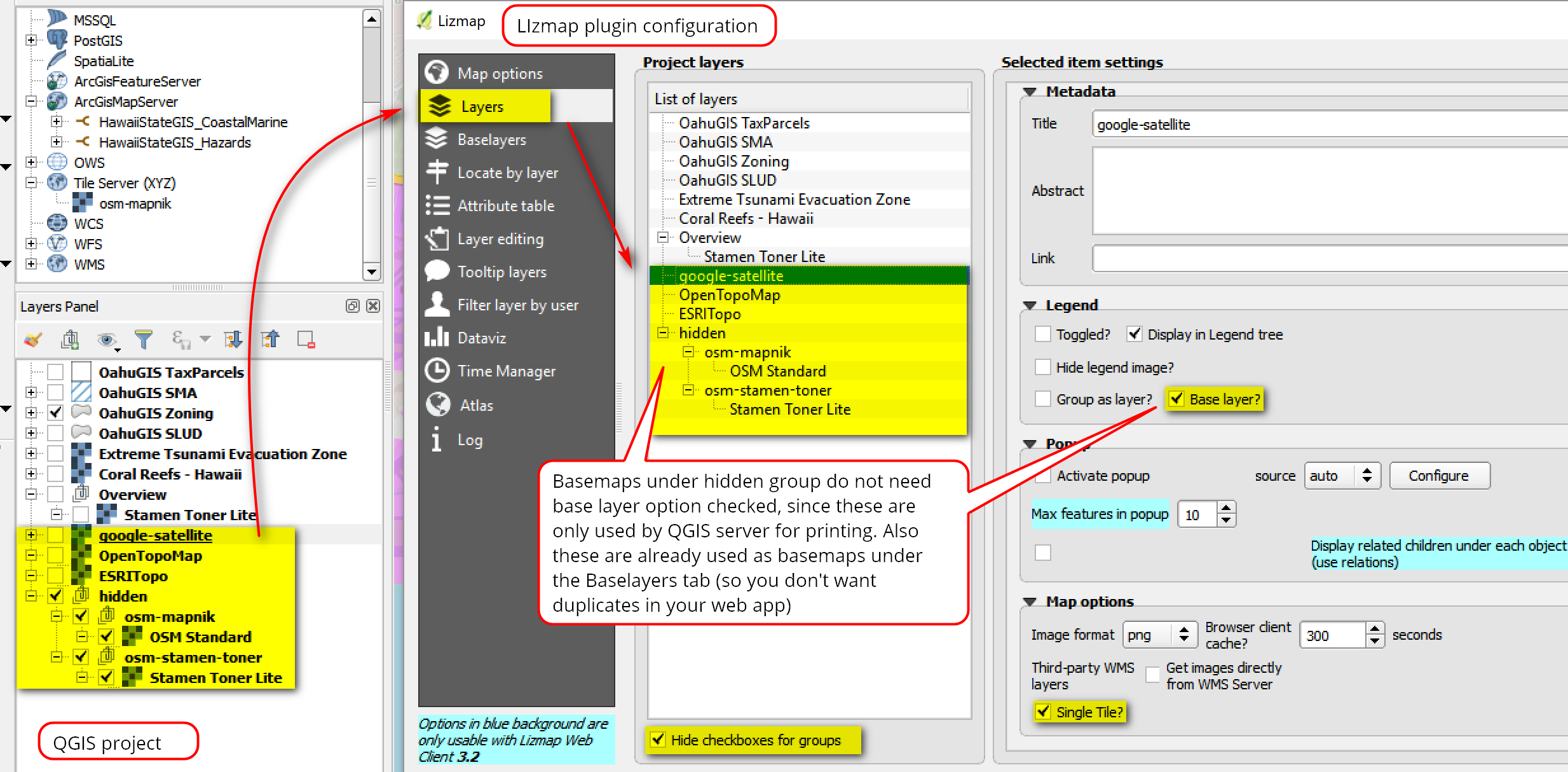 For hidden groupings: No need to check option to use as base layers since these are hidden anyway and will only be used for printing purpose. Also these are already part of the default lizmap baselayers options and you don't want duplicate basemaps in your web app.