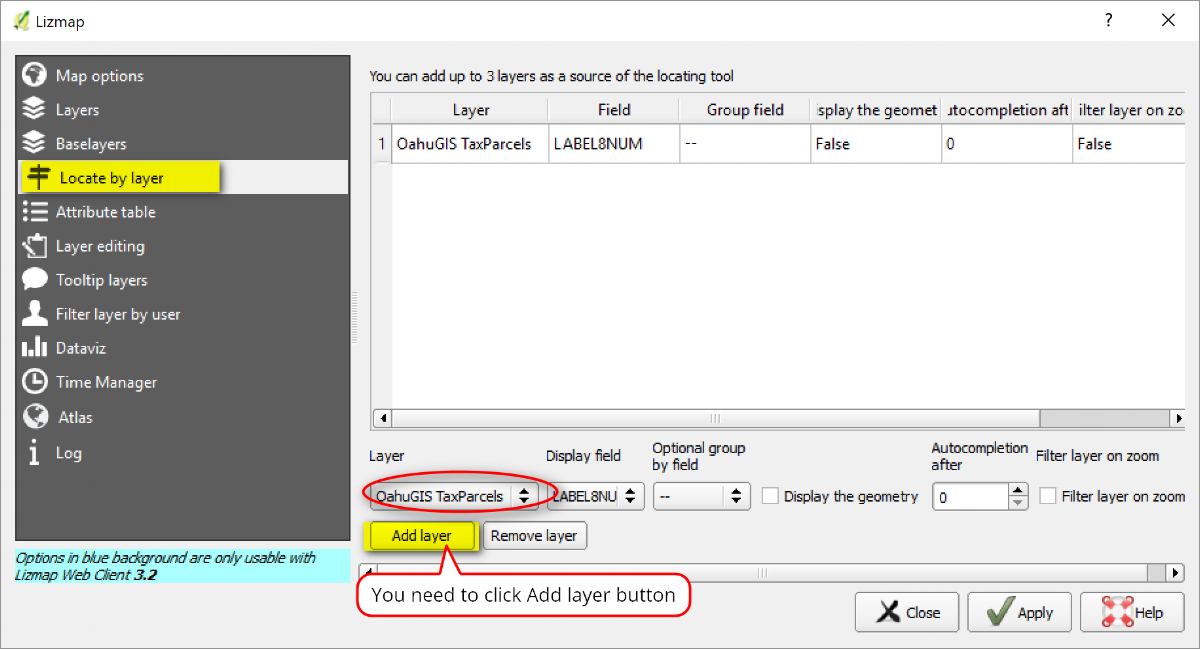 Locate by layer tab options: Here I am adding the Tax Map Parcel (TMK) layer, so I can search by TMK number.