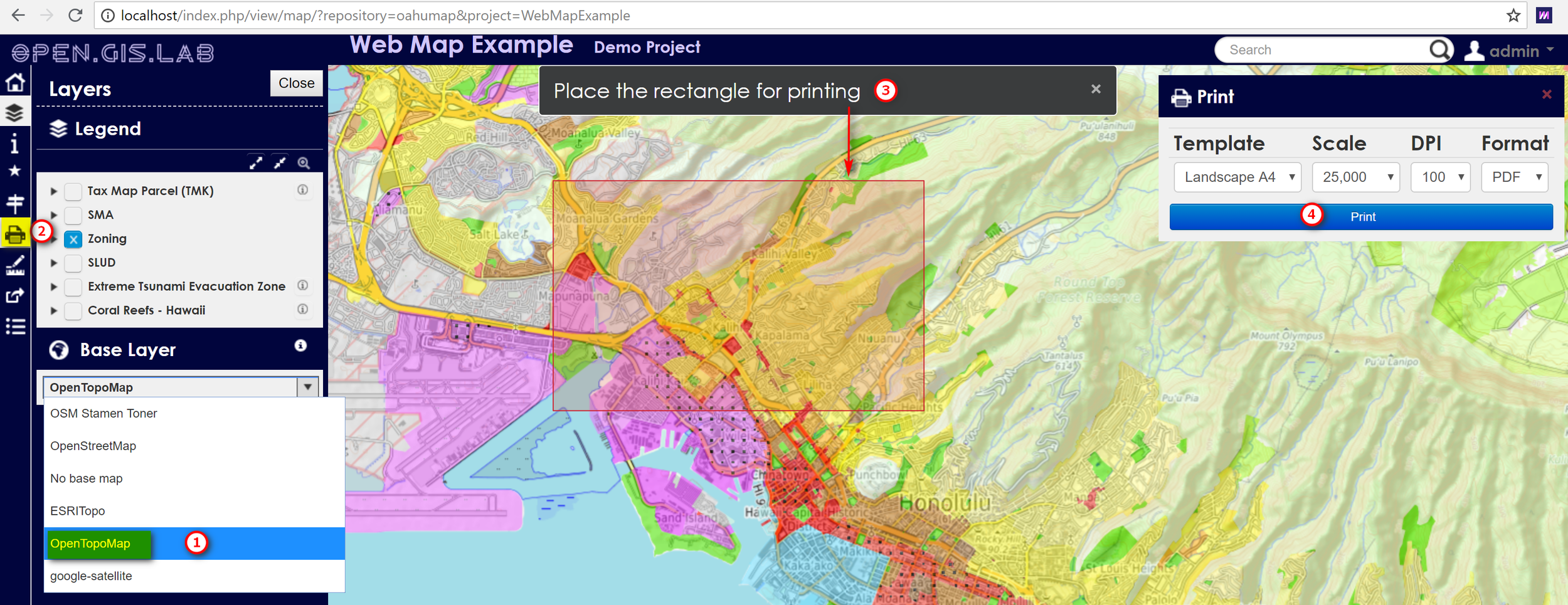 Here's an example of my print composition. It is a simple A4 landscape layout. Create your print compositions and save your project, then in the web app you can select the layout to use as template for printing.